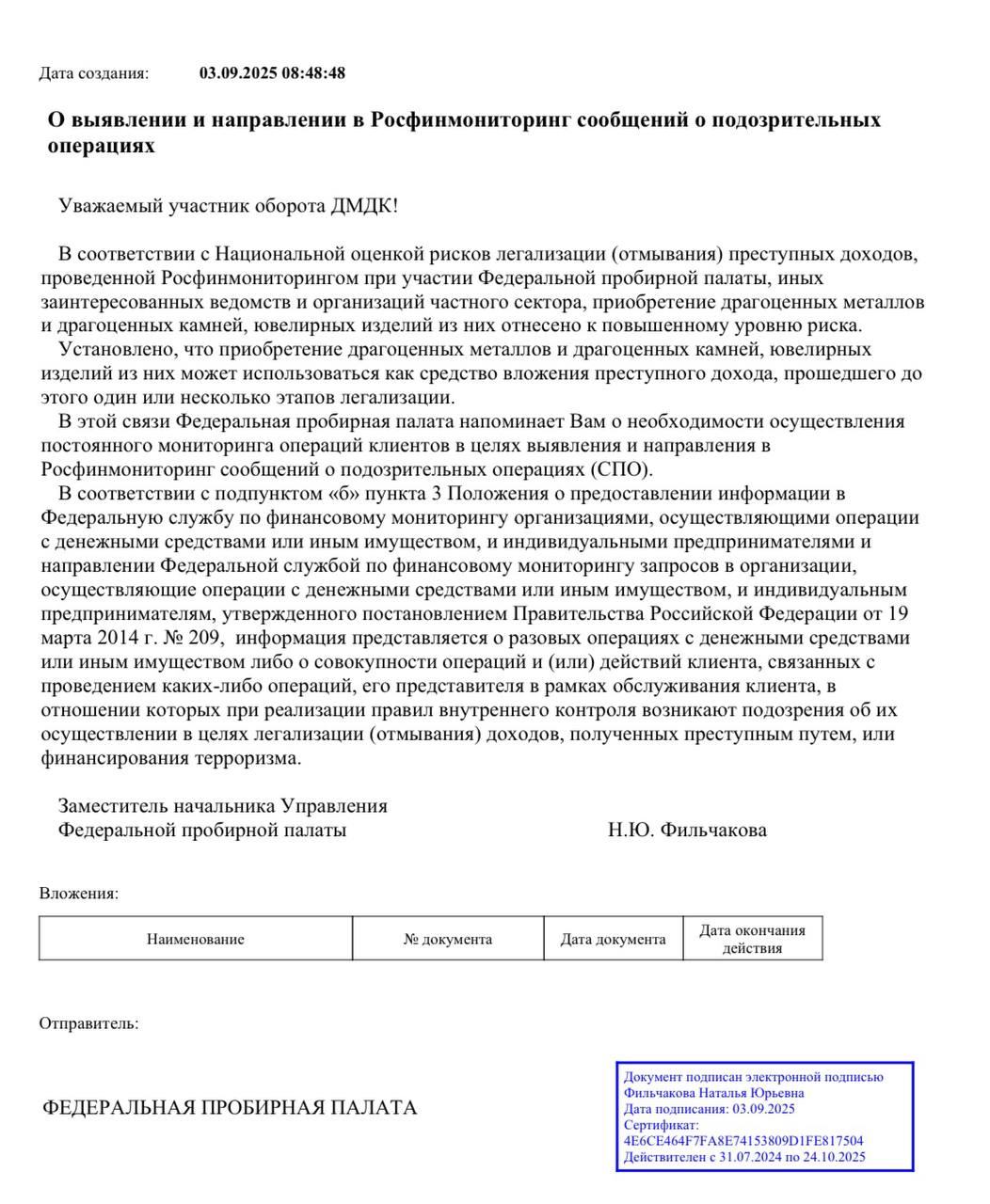 09 сентября 2025 Федеральная пробирная палата (ФПП) опубликовала информационное сообщение от 3 сентября 2025 года, которое касается участников рынка драгоценных металлов и камней (ДМДК). Главный акцент — приобретение драгоценных металлов, камней и изделий из них отнесено к операциям повышенного уровня риска в рамках Национальной оценки рисков, проведённой Росфинмониторингом совместно с ФПП и другими ведомствами. Почему это важно? Драгоценные металлы и ювелирные изделия нередко используются для вложения преступных доходов, прошедших предварительные этапы легализации. Именно поэтому регулятор требует от участников рынка более внимательного мониторинга операций клиентов. Что нужно делать компаниям и ИП? ФПП напоминает о необходимости: постоянного мониторинга всех операций с ДМДК; выявления сделок, которые могут носить подозрительный характер; направления сообщений о подозрительных операциях (СПО) в Росфинмониторинг. На что ориентироваться? Согласно Постановлению Правительства РФ от 19 марта 2014 г. № 209, информация представляется в Росфинмониторинг: по разовым операциям клиента, по совокупности операций или действий клиента (и его представителей) — если у субъекта возникают обоснованные подозрения в легализации доходов или финансировании терроризма. Вывод для бизнеса Игнорировать эти требования нельзя: отсутствие сообщений о подозрительных операциях рассматривается как нарушение правил внутреннего контроля. Для ювелиров и ломбардов это означает необходимость наладить систему выявления СПО, обучить сотрудников и внимательно анализировать деятельность клиентов. Эксперты отмечают: сейчас регулятор усиливает внимание к операциям с ДМДК, поэтому формальный подход «не заметили — не отчитались» может стоить компании серьёзных санкций. Связанные услуги Абонентское обслуживание по 115-ФЗ для ювелиров Подробнее Вебинар по ПОД/ФТ/ФРОМУ Подробнее Годовой отчет о рисках ОД/ФТ Подробнее Предедущая новость С 1 марта 2026 — новые правила оборота инвестиционных слитков! Следующая новость Патентная система для стационарной торговли уходит в прошлое: что ждёт ювелиров с 2026 года