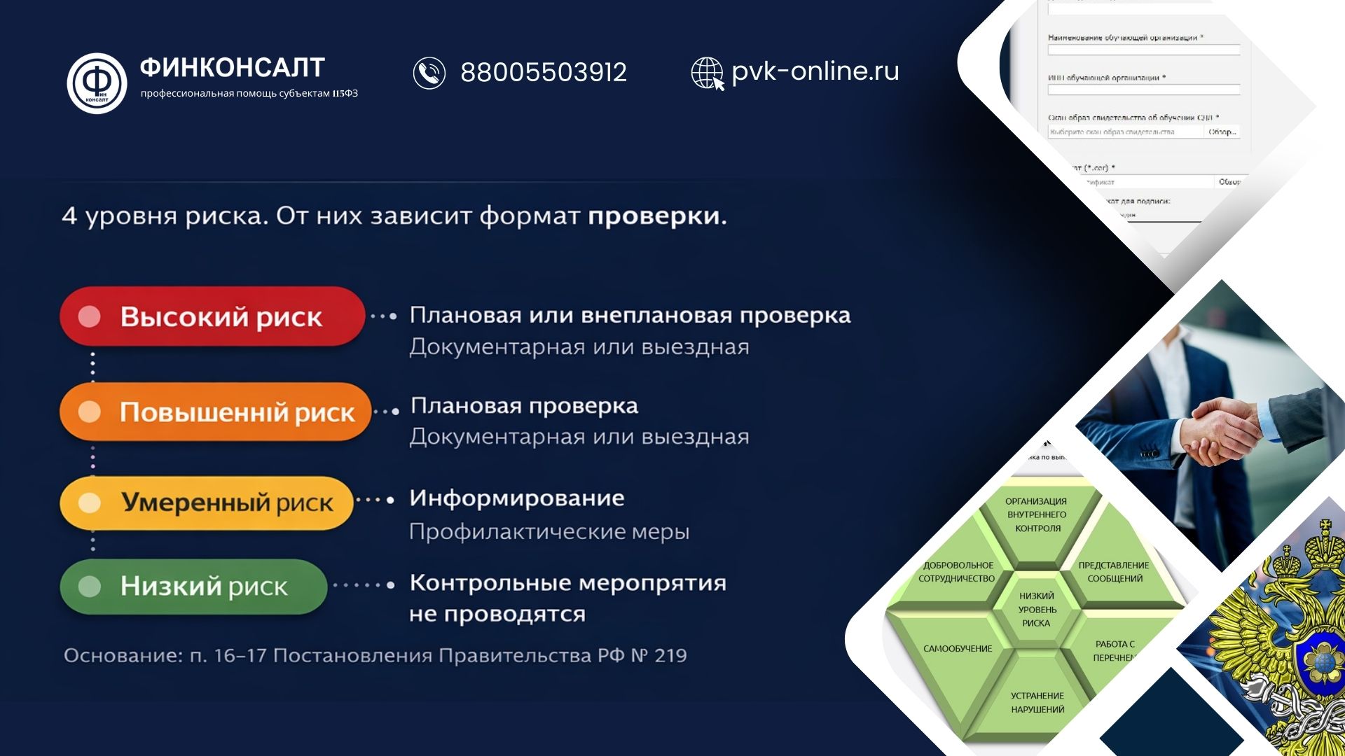 17 февраля 2026 3 Постановление Правительства РФ от 19.02.2022 № 219 закрепило систему контроля в сфере ПОД/ФТ/ЭД/ФРОМУ и прямо ввело риск-ориентированный механизм надзора. Если упростить юридическую конструкцию, логика следующая: сначала субъекту присваивается уровень риска, затем в зависимости от этого уровня определяется формат контрольных мероприятий. Именно эта связка делает документ практически значимым. 1. Кого касается Положение № 219 Положение распространяется на организации и индивидуальных предпринимателей, указанных в статье 5 Федерального закона № 115-ФЗ, за исключением тех, чья деятельность регулируется Банком России. Это, в частности: • участники рынка ДМДК, включая ювелиров; • риелторы; • операторы почтовой связи; • аудиторские организации; • бухгалтерские структуры; • иные субъекты, подпадающие под 115-ФЗ. Банк России выведен из общего режима, за исключением отдельных случаев информационного взаимодействия. 2. Дистанционный мониторинг и личный кабинет Положение закрепляет систему дистанционного мониторинга. Уполномоченный орган рассчитывает индикаторы риска на основе анализа операций и иной информации, находящейся в его распоряжении. Результаты дистанционного мониторинга размещаются в личном кабинете субъекта на официальном сайте уполномоченного органа. Важно: алгоритм расчета индикаторов риска не раскрывается и не подлежит передаче третьим лицам. 3. 4 уровня риска. Это ключевая норма В соответствии с пунктом 16 Положения деятельность контролируемого лица относится к одному из четырех уровней риска несоблюдения требований законодательства: • высокий; • повышенный; • умеренный; • низкий. Именно этот уровень определяет формат дальнейших действий контролера. 4. Какие меры применяются при каждом уровне риска Пункт 17 Положения прямо связывает уровень риска с формой контроля: Высокий уровень → плановая или внеплановая проверка в форме документарной или выездной проверки. Повышенный уровень → плановая проверка в форме документарной или выездной проверки. Умеренный уровень → информирование. Низкий уровень → контрольные мероприятия не проводятся. Это и отражено на схеме, которую мы приложили. Схема наглядно иллюстрирует механизм пунктов 16–17. 5. Как результаты мониторинга влияют на дальнейшие проверки Результаты дистанционного мониторинга используются: • для определения уровня риска; • для выбора контрольных мероприятий; • для обмена информацией между органами контроля; Например, риск-индикатор, рассчитанный уполномоченным органом, может учитываться профильным контролером при формировании собственной модели оценки рисков. 6. Форматы контроля Положение предусматривает: 1. Профилактические мероприятия анкетирование; информирование: доведение правоприменительной практики. 2. Контрольные мероприятия: документарные проверки; выездные проверки; Проверки проводятся без согласования с прокуратурой на основании распорядительного акта органа контроля. 7. Сроки проверок Продолжительность: • выездная проверка — до 30 календарных дней; • документарная проверка — до 90 календарных дней. Срок может быть продлен, но не более чем на 30 календарных дней. 8. Что проверяют Предмет проверки: • соблюдение требований законодательства о ПОД/ФТ/ЭД/ФРОМУ; • соответствие внутренних процедур требованиям закона; • испол